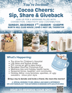 Join us for a cozy and heartwarming morning of connection, creativity, and contribution! This festive gathering is the perfect way to kick off the holiday season—complete with cocoa, laughter, and giving back to our community.