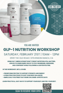 GLP-1 Nutrition Workshop with former celebrity trainer Debi Beebe—learn simple ways to stay nourished, energized, and confident. Join us for a GLP-1 Nutrition Workshop designed to help you stay nourished, energized, and confident while using GLP-1 medications and following a lighter eating routine.