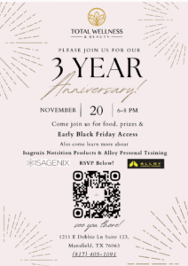 Join Total Wellness & Beauty, our local Brand Partner with Isagenix, for their 3-Year Anniversary event! It’s the perfect night to celebrate wellness, beauty, and transformation ✨ plus enjoy food, prizes, and exclusive early Black Friday deals! You’ll also get to experience what makes Isagenix so powerful with Donnetta Norris! From energy to hydration to protein that helps you feel and look your best this season and beyond. 💪🏼 If you’re in the DFW area, come see everything Total Wellness & Beauty has to offer and discover how Isagenix can help you glow from the inside out.