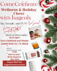 Come Celebrate my 22nd Isagenix Anniversary. Sip, sample and wear your best Santa Hat!