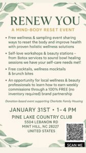 A donation based wellness & self-care event to help you relax and reset. Proceeds will go to support Charlotte Family Housing