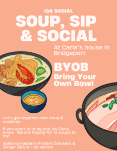 Let’s get together over soup & socialize. If you want to bring one, let Carla know. We are hoping for 12 soups to try! Salad w/Isagenix Protein Crackers & Ginger BEA will be served.