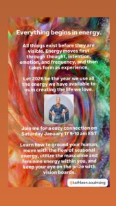 Everything begins in energy. All things exist before they are visible. Energy moves first through thought, intention, emotion, and frequency, and then takes form as experience. Let 2026 be the year we use all the energy we have available to us in creating the life we love. Learn how to ground your human, move with the flow of seasonal energy, utilize the masculine and feminine energy within you, and keep your eye on the prize with vision boards.